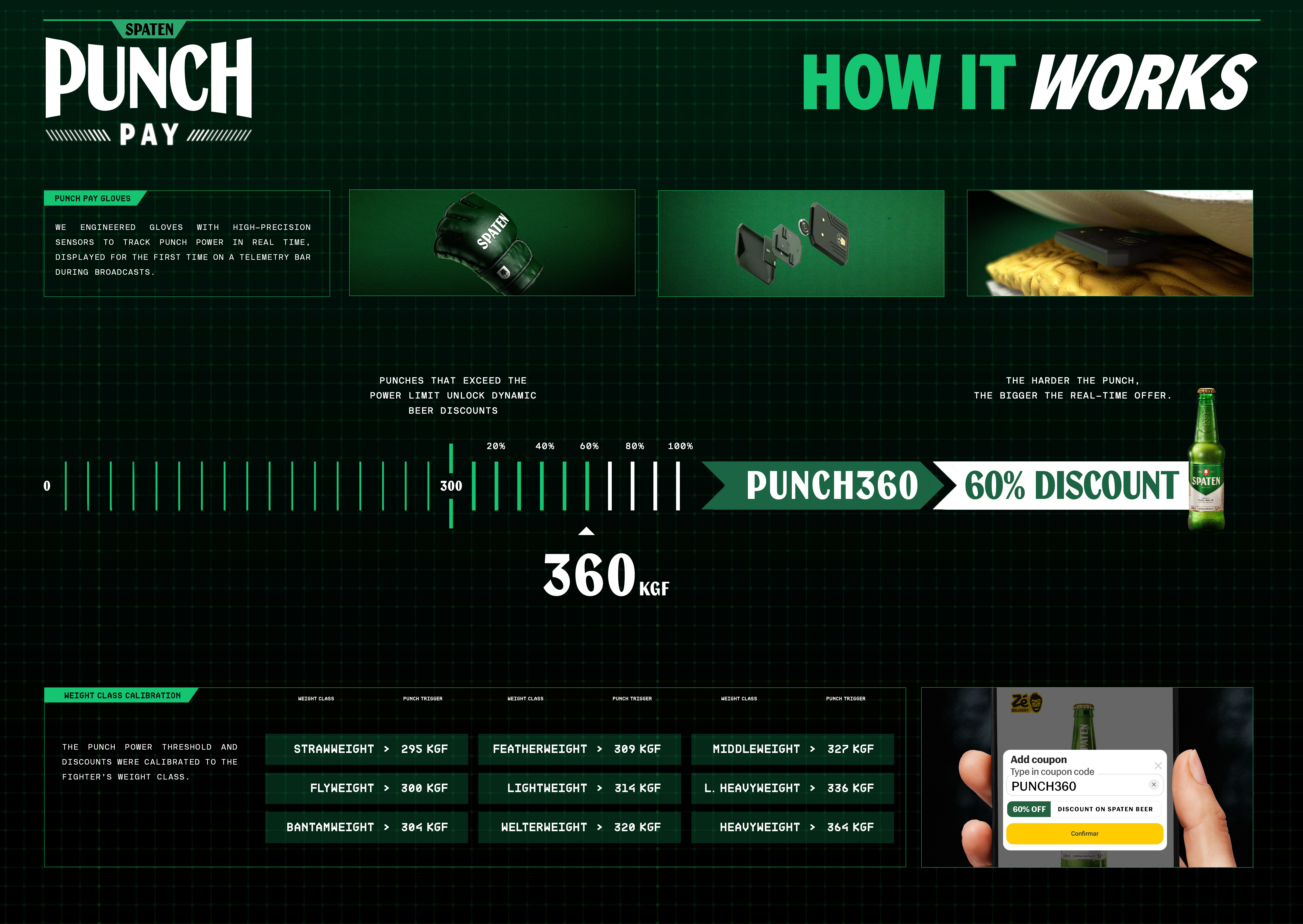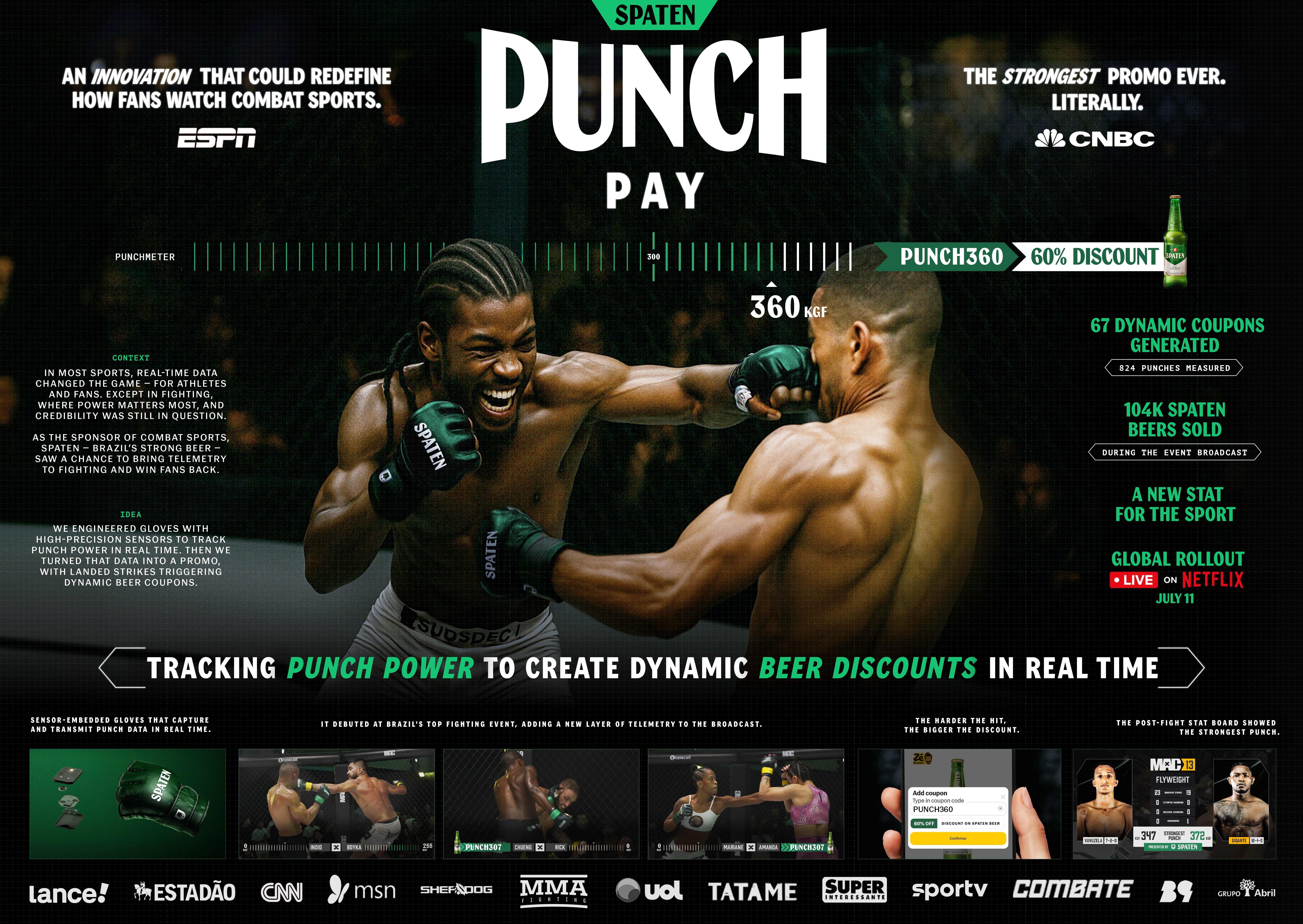 Punch Pay turned punch power in the ring into beer discounts for fans at home. By engineering gloves with real-time sensors, Spaten measured the impact of each landed strike and instantly converted it into dynamic coupons delivered during the broadcast. Debuting at Brazil's biggest fight event, the mechanic linked the intensity of the fight to the consumption moment of a cold, strong beer.